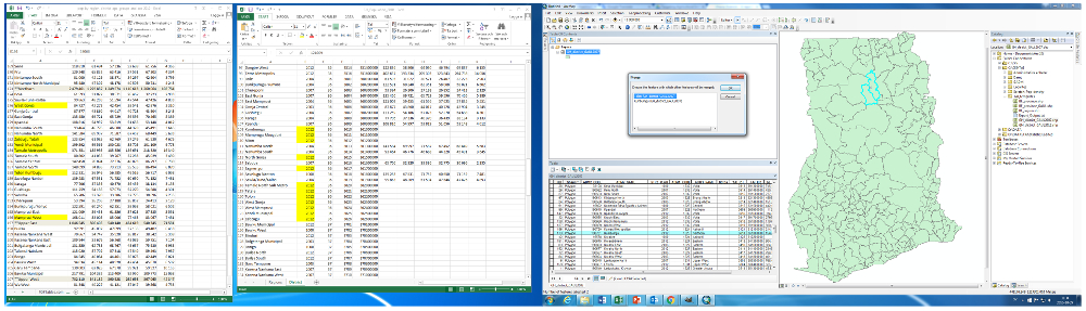 I’m cleaning data. Tracing changes to Ghana’s district divisions, trying to make different datasets match. Data collected by different ministries is not always consistent, district names are spelled differently, districts having been split means data collected at different times needs to be merged. Having several spreadsheets and a GIS open at once on my two screens, just to make sure all edits are done in the same way.
