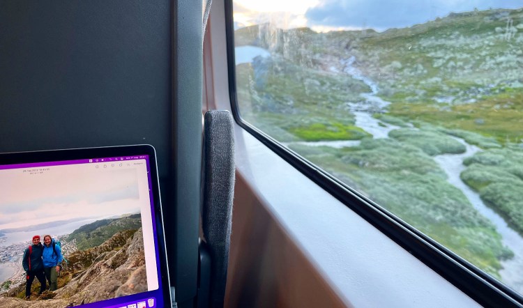 Later, I edit photographs while the still snow-covered mountains pass by my window. A windy picture of Hannes on the top of Ulriken – just one of all the visitors I’ve already had. Can that be one of the measures of making a new place your home: How easy it becomes to act the tourist guide?