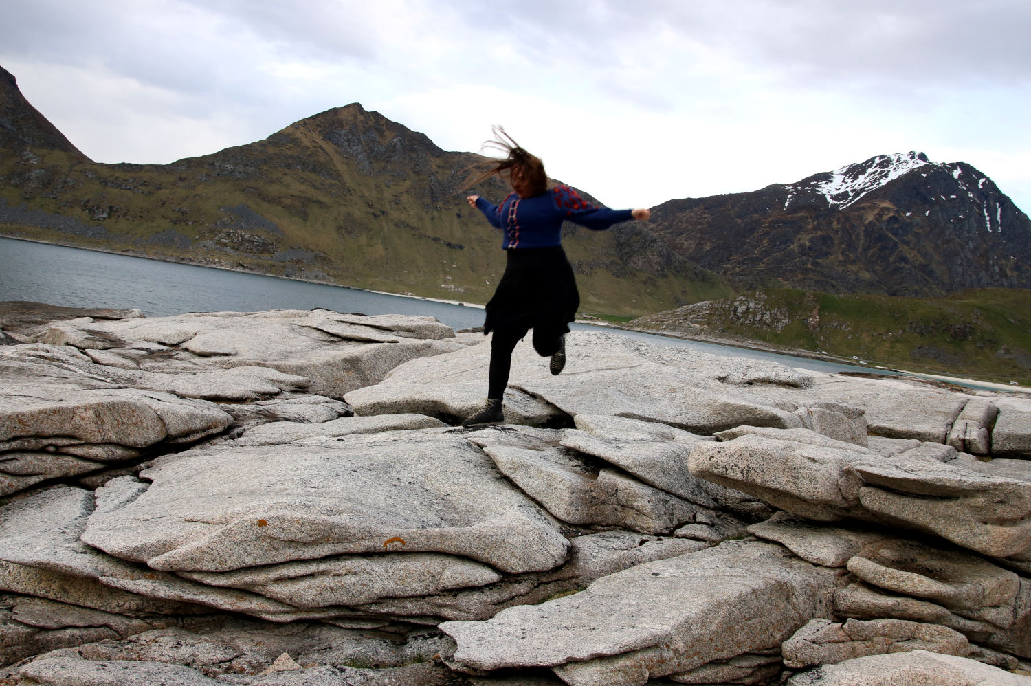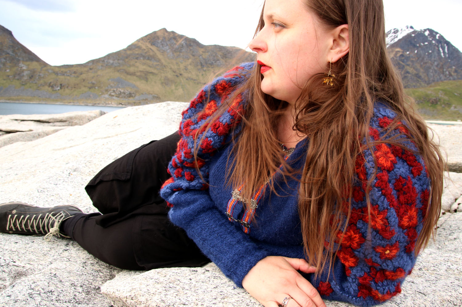 The body in the embroidered flower cardigan. On a rock by the North Atlantic Ocean. Lofoten, end of May. Half way.
