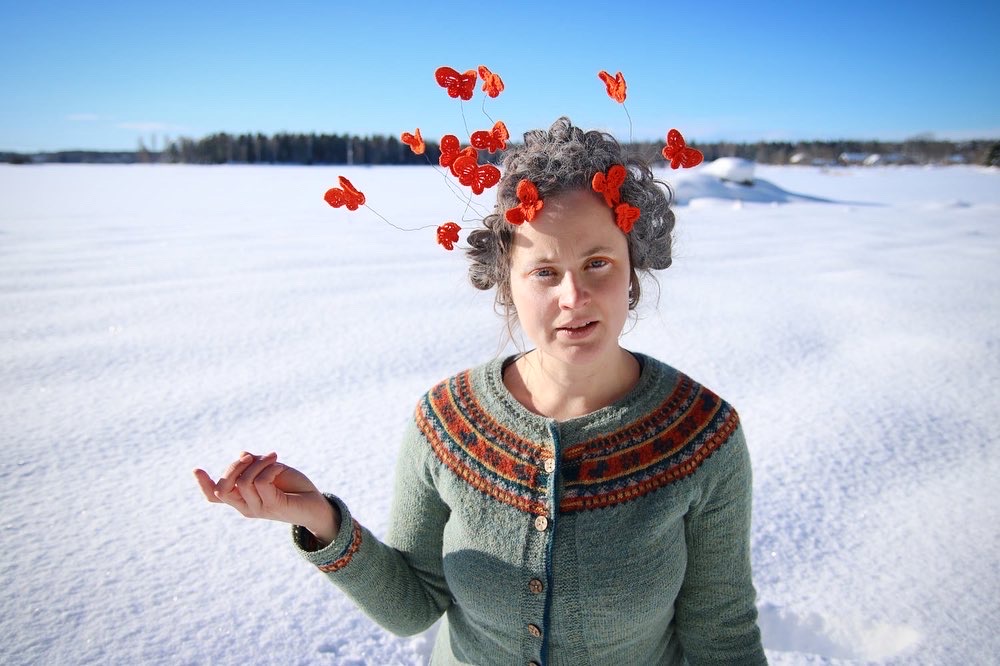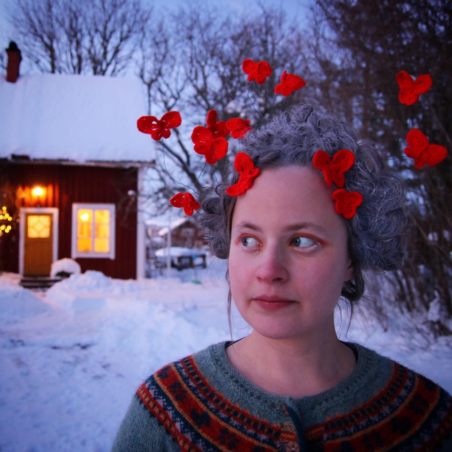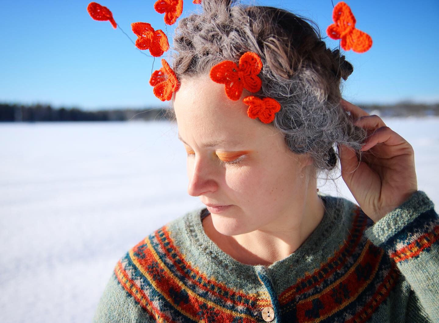 Either way, it turned out too tight and I didn’t feel like unravelling it all, so. I crocheted some extra room into it along the bottom edge – an advantage of the cardigan. It looks a bit odd. If it had been meant for someone else, I would have been too embarrassed to give it to them. For myself, I’m fine with it. I think the pattern on the yoke, especially the colors, turned out so nicely, I can look past the awkward bottom half. And now I know to be better with the measurements for future cardigans. It worked for the Harbinger of Spring, though. A month after her forays in the Roslagen snow, spring had arrived. And that same afternoon, I saw the first butterfly of the year. It fluttered past my home office window so quickly, I didn’t properly see – but I think it could have been a small tortoiseshell butterfly. It definitely looked orange. Maybe one of the butterfly daemons gotten loose from the Harbingers crown.