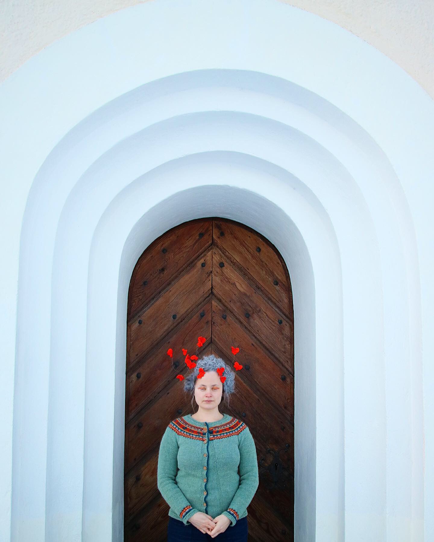 It had been a couple of years since I finished the mint-colored cardigan with butterflies on the shoulders. Natalia and I thought about using it for our first ever photoshoot, the one with the enormous flower crown, but then I got this idea. The butterflies. Wouldn’t it be fun to spin off that in the styling instead?
