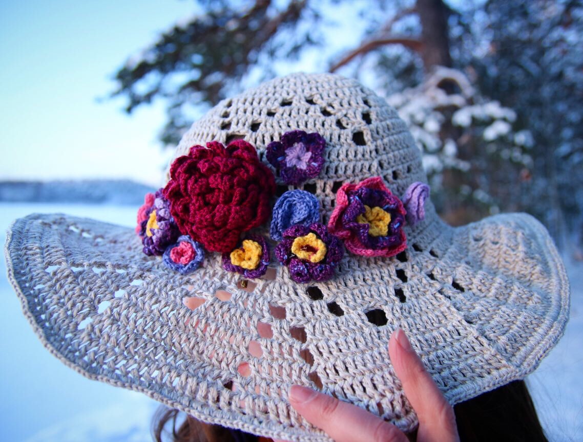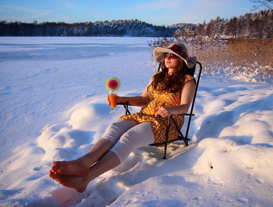 On the coldest day of winter, Natalia borrowed a car and came over to my side of town. We packed it full with hot chocolate and mandarins and drove to lake Flaten. The perfect place for a swim in summer. Now, covered in a soft white blanket. I crocheted a flowery sun hat last summer using linen-cotton yarn blend, wore it while weeding in the allotment garden. We didn’t get around to photographing it then, though, and then I had the thought: wouldn’t it be fun with the contrast? A summer sunbather in a snowdrift.