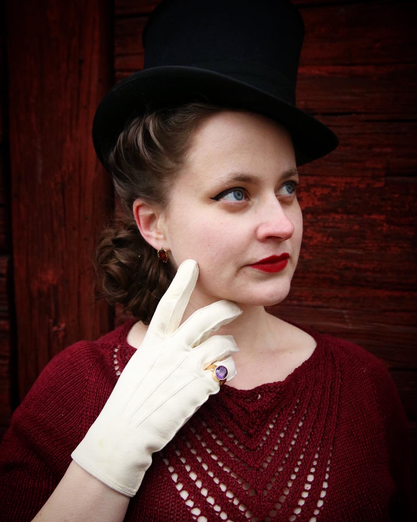 About the photo shoot: Here’s the doctoral defense dress, photographed after I had had a couple of months to recuperate after the big event I made it for. Worn together with my great grandmother’s amethyst ring and my great grandfather’s top hat and cane. Hair sculpted and face made up by Natalia Salazar. Dress designed by me, made from Järbo Lin.