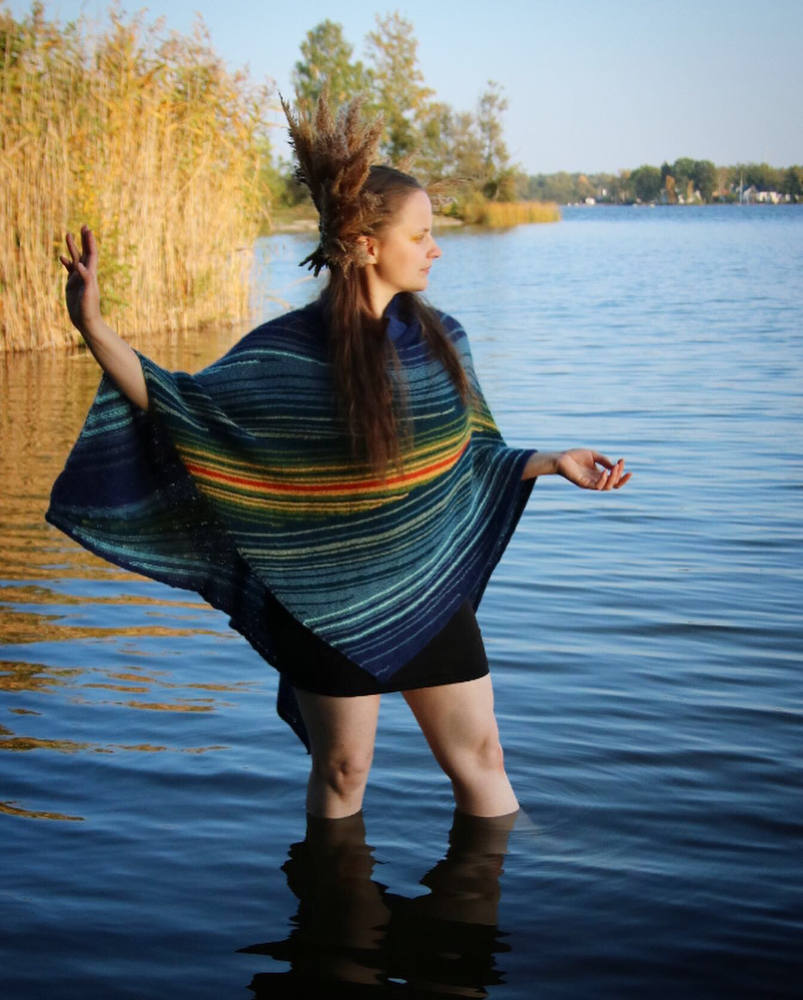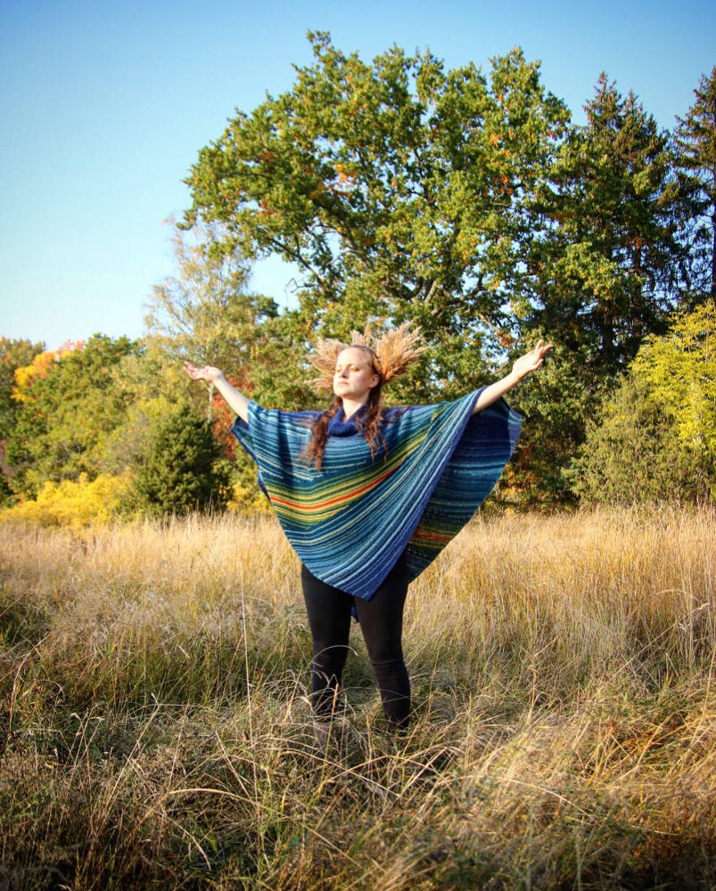 I made it during the winter 2019-20, with the idea of having it at work. My office was in an old building where heating in the winter is very uneven. Some rooms were warm enough to only wear a T-shirt in, while others almost required double wool jumpers. With the activity based workspace we had, planning office outfits in the morning was be really difficult because I never knew where I’d end up. So I thought, a wool poncho is a good option, it’s easy to take on and off and will fit over whatever I happen to wear that day. Yey! I finished it in the end of February. And then the pandemic came. No more need for an office poncho, because I never went to the office.