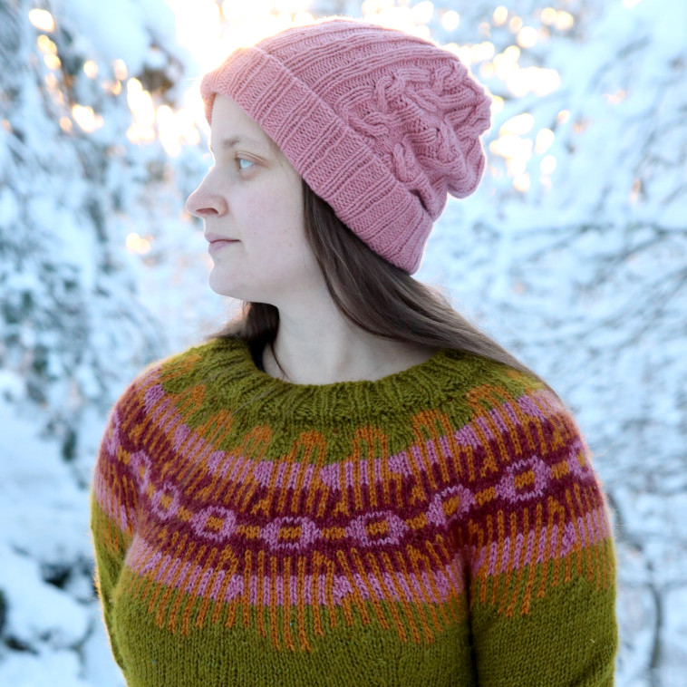 I like the Icelandic-style jumper. I have a basic pattern that I follow, knitting it on circular needles from neckline to bottom, in medium thick alpaca wool. It makes the jumper quick to make, relative to its size, and it is warm and soft and fuzzy and perfect to wear when you want to be comfortable on chilly days. It is also easy to customize. For every jumper I knit, I make a new repeating pattern for the yoke and adjust the color scheme. The thickness of the yarn (and therefore also the thicker needles) means that I can knit for longer without my fingers cramping, which is great for dark winter Sundays when all I want to do is binge TV series and drink tea.