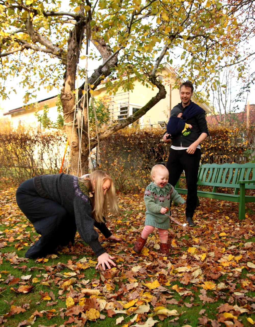 Which resulted in: A sunny afternoon in October 2024, I photographed Cecilia and Selma among the autumn leaves in their garden. Isak and Nic also joined – but not yet as stylishly dressed as the girls. Natalia was there too, helping out with making the leaves dance for the laughing children.