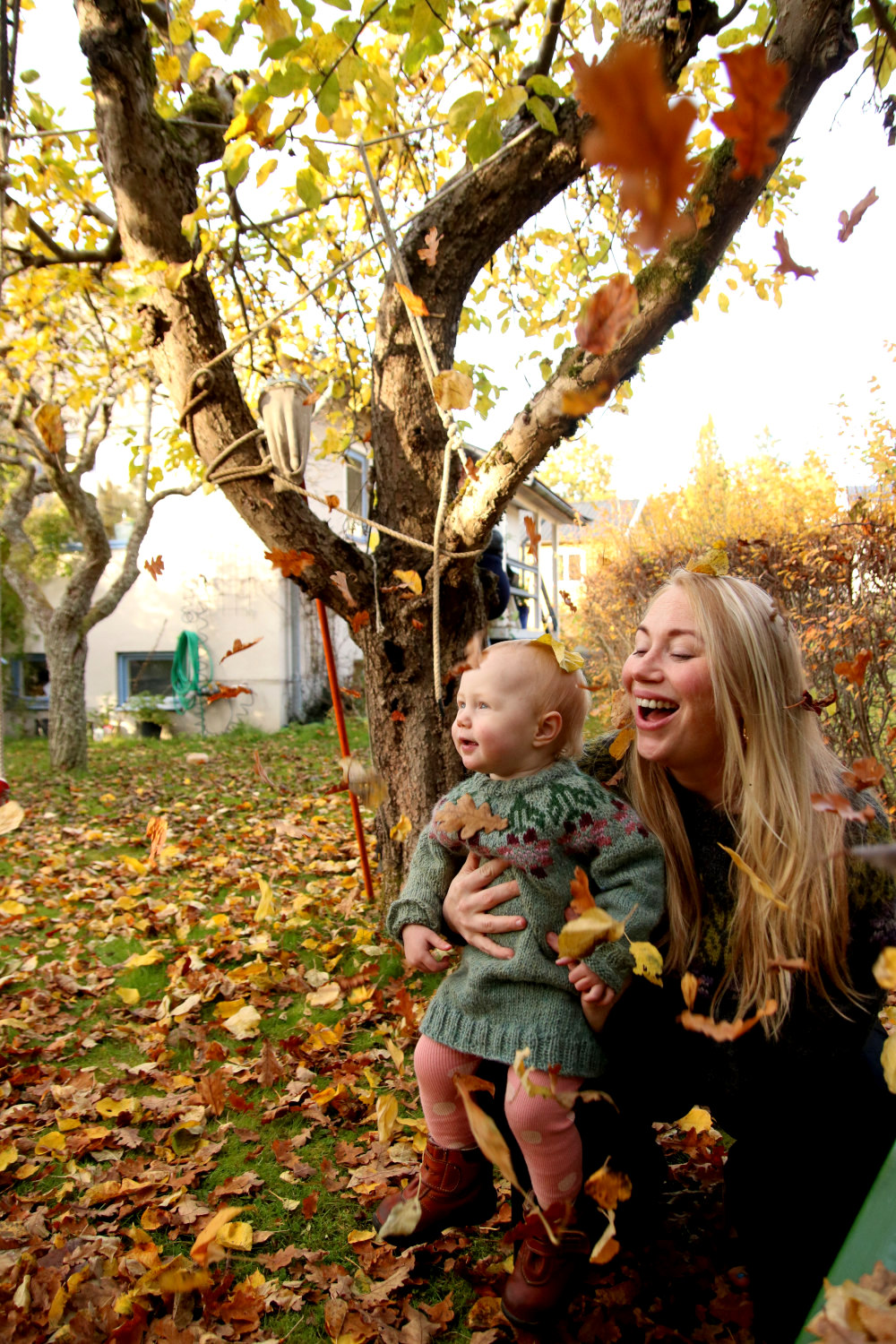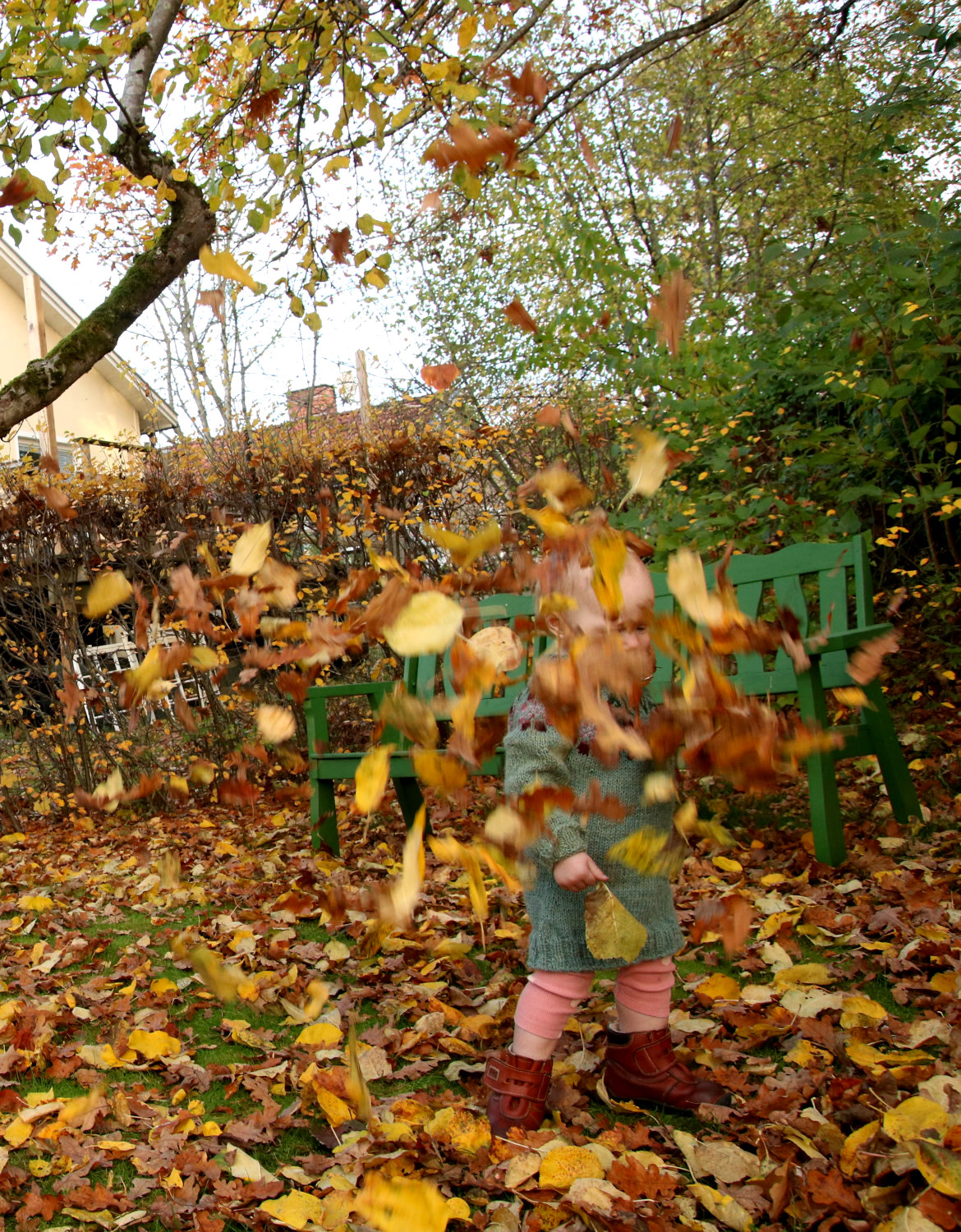 Making it rain leaves over a laughing one-and-a-half-year-old.
