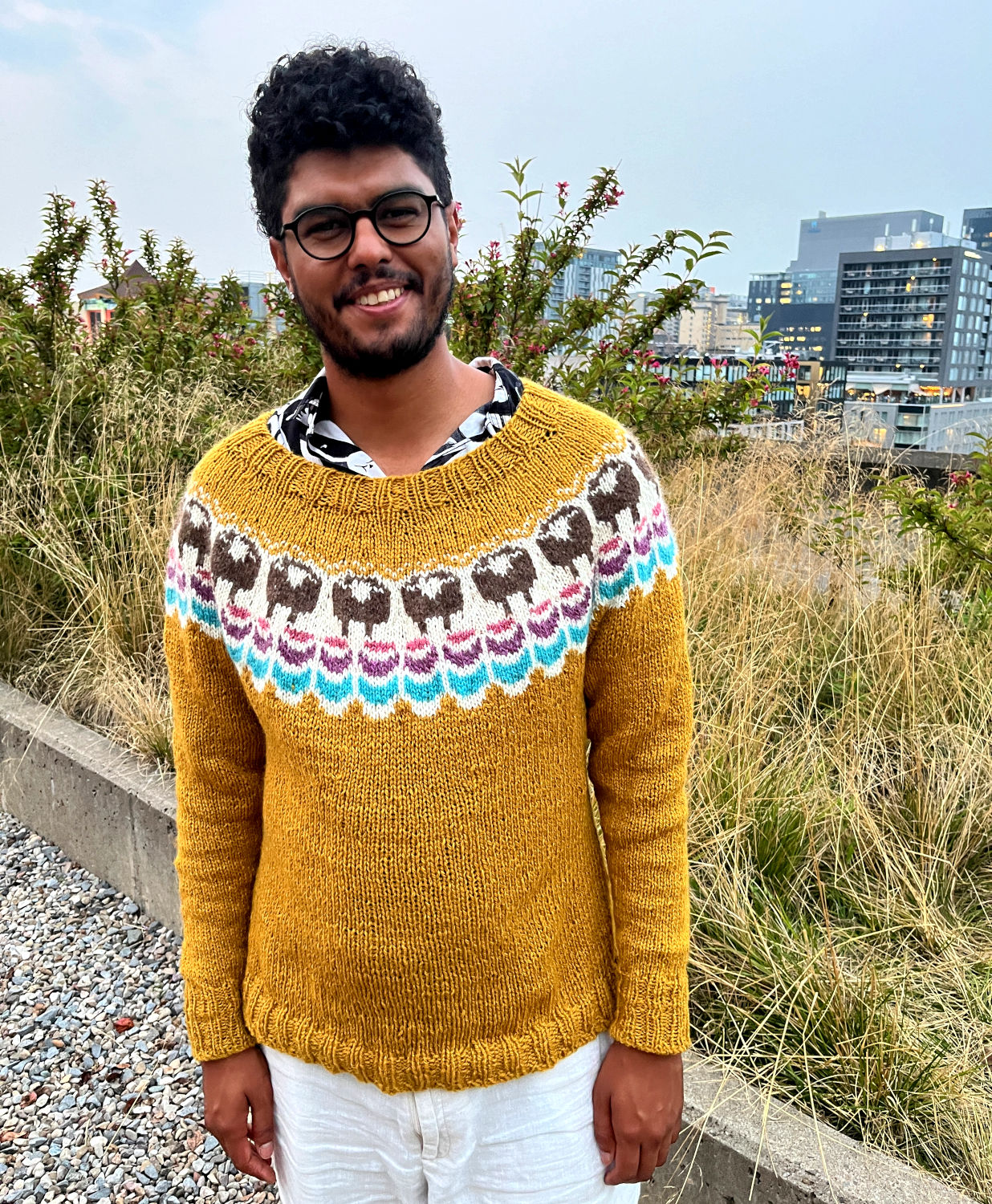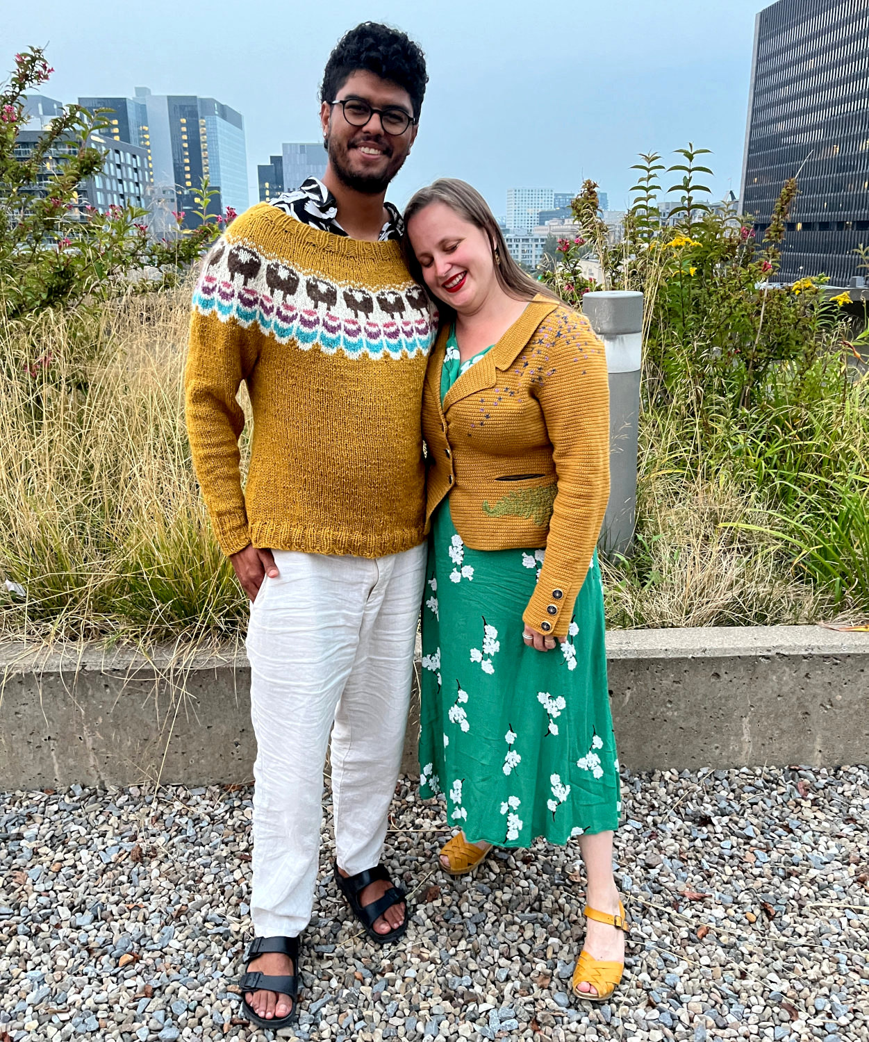 By the end of the summer, I was done. Rafa and I met again at a conference in Montreal, Canada, and I gave him his jumper. To me, it was perfect for him. And August in Montreal is really much too hot for a western Norwegian sheep wool jumper, but we had to photograph it anyway, in a rooftop garden at the end-of-conference party. Me, also, in my matching crocheted linen blazer, the still-in-progress embroidery my handicraft-based conference focusing tool.