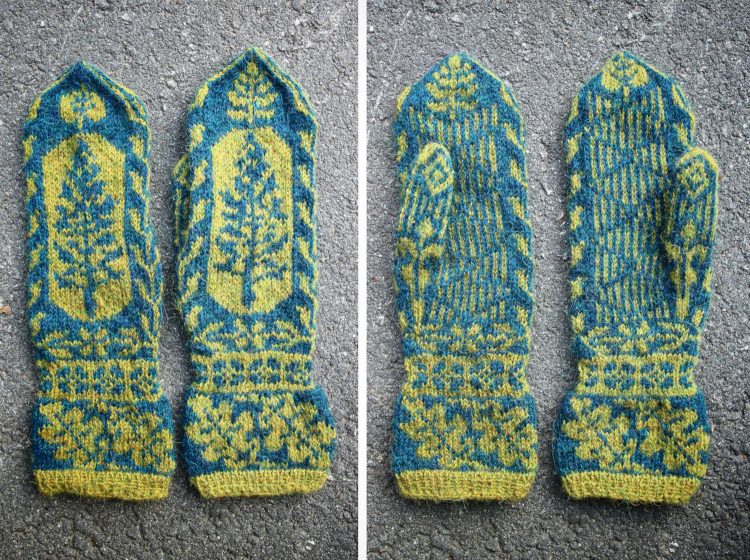 After my defense five weeks later, I gave Lisen these mittens. In the last of my thesis papers, I had interviewed forest owners about special places on their properties. Many chose an old oak or pine tree as one of their places. In the postscript of the thesis, I wrote about the linden tree my grandmothers paid to have planted in a Stockholm park as a gift for me when I was born. And the ash Yggdrasil is the tree of life in Norse mythology. So I decorated Lisen’s mittens with a pine tree and leaves from oak, linden and ash.