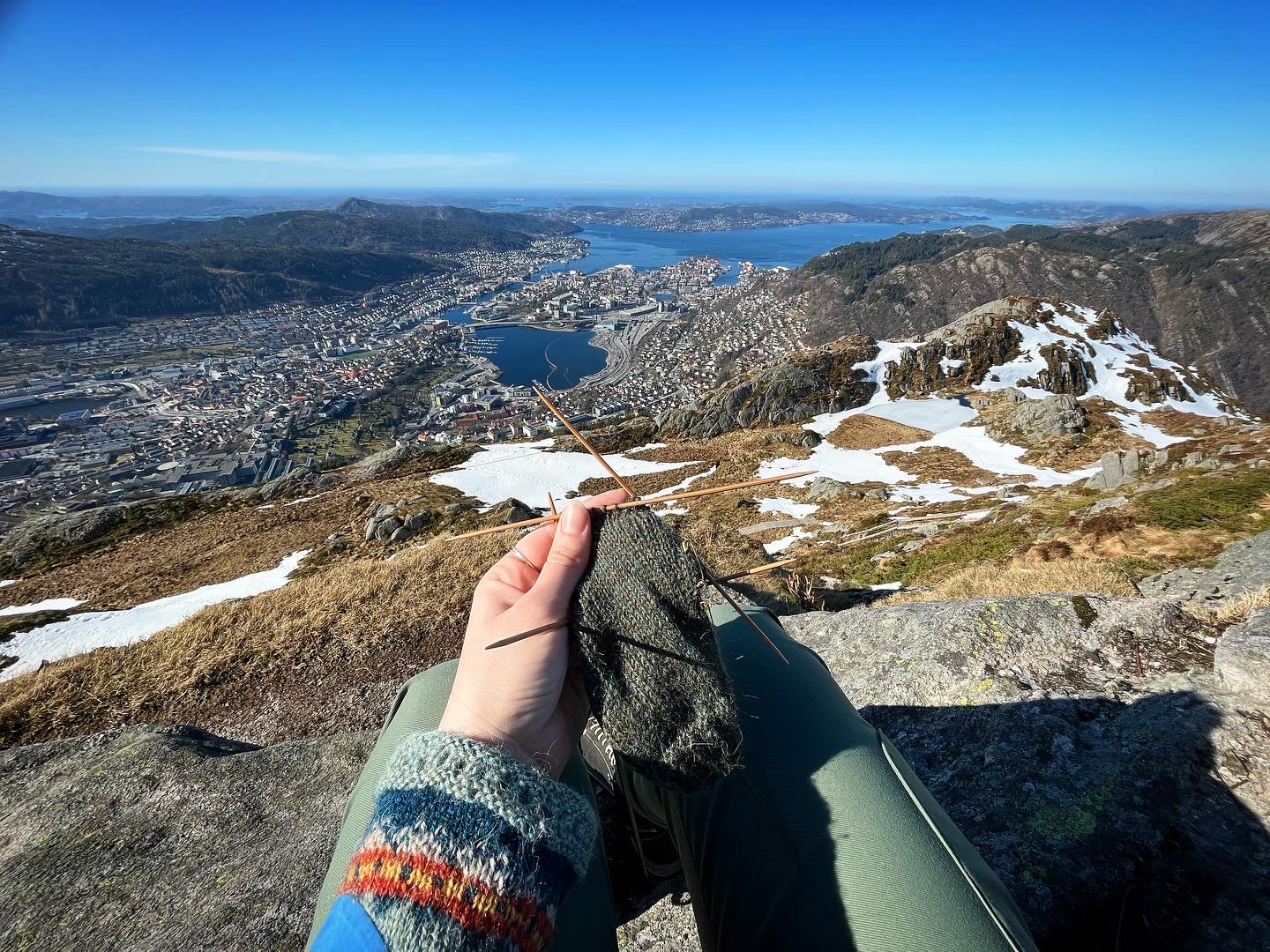 And finally: the vistas. Jeez. I went to the top of Ulriken, the highest of the seven mountains that surround Bergen today. Inspired by Josefin W, a knitter I follwo on Instagram, I brought Alvar’s jumper-in-progress with me for some outdoor knitting. Feels unnecessary to say, but this is the most dramatic view I’ve ever had while knitting.