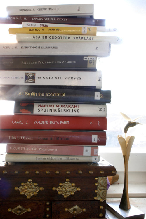 Det är ju det jag gör. På ett nästan sjukligt sätt, slukar jag böcker och gör listor av dem. Kategoriserar, skriver om, mitt liv skulle kunna rekonstrueras kring böckerna jag läste. Första veckorna i ettan av gymnasiet – Mrs. Dalloway av Virginia Woolf. Dagen då min farmor dog – Blonde av Joyce Carol Oates. De sista dagarna innan studenten – Montecore av Jonas Hassen Khemiri. I flygplanet över Atlanten, i bussen uppför de peruanska Andernas sluttningar på väg mot Bolivia – Rosen på Tistelön av Emilie Flygare-Carlén. Första dagen på geografiprogrammet, när jag satt bredvid Elin på introduktionen och hörde Anders Fridfeldt föreläsa för första gången – Oath of gold av Elizabeth Moon.