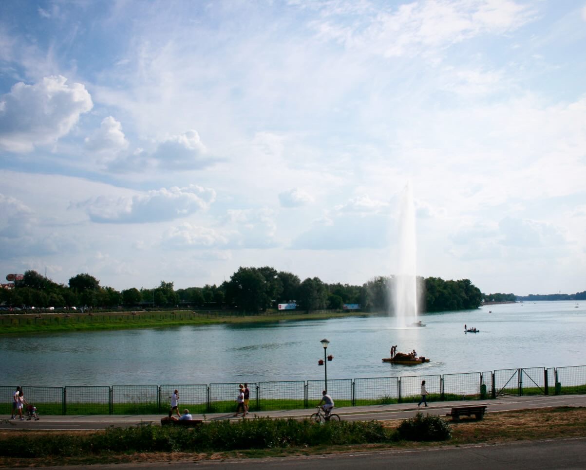 Ada Ciganlija is the artificial island in the Sava River that creates a lake, which in turn is surrounded by beaches, boardwalks and bars. Tons of people come here, especially on sunny weekend afternoons. A favorite spot for Belgradians to spend their leisure time. From the northern tip of the lake, the Ada Bridge is in plain view. It is a magnificent bridge. Really beautiful.