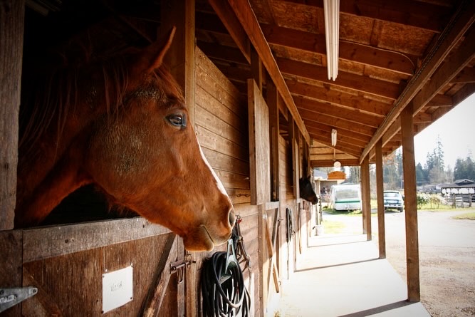 Eleven of the horses live in a row of outdoor boxes with doors that open to paddocks in the back and the remaining four in larger paddocks with sheds for shelter from the rain.