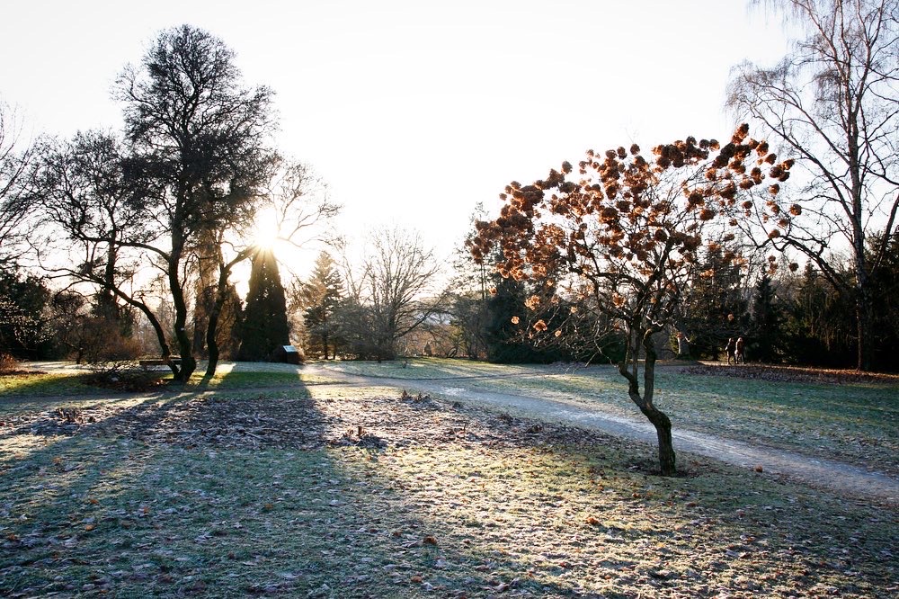 Mid-January in Oslo doesn’t offer much in the way of greenery, but the frost that covered the grass and branches made everything glitter in the setting sun. The garden takes up an entire inner-city block and has a hill in its center. The garden is mainly open grass and old groves of deciduous trees, flowerbeds and small ponds on the hillsides. I can imagine it being lush and full of flowers in late May. Now, the browns and gray-greens that ranged from moss and mint felt very tranquil. Like a breath of fresh air in the middle of the busy city center.