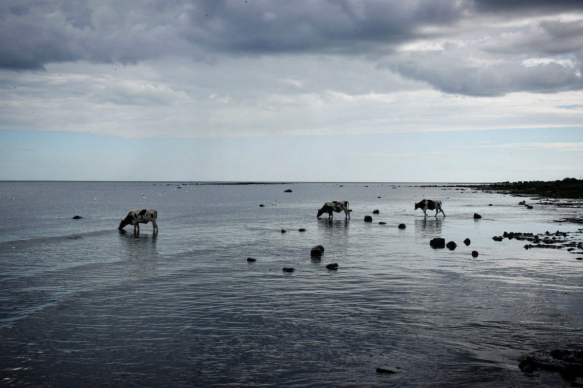 We cycled past fields of wheat, oats, barley and forage, potatoes, peas, beans, onions and maize. It was harvesting season, so there was a lot of activity in the fields. In the afternoon of our second day, dark clouds started building on the horizon and by evening, we had to race through a wall of rain. It was incredible, the drama of the sky and how the sea mirrored its color – but we got soaked and would probably have had a really unpleasant night in the tent. Luckily, at dusk, we happened upon a hostel with an empty double room. After a hot shower, dry clothes and some warm food in our stomachs, having experienced the ferocious rain only improved our memories of the day. And the next morning, the sun was shining again.