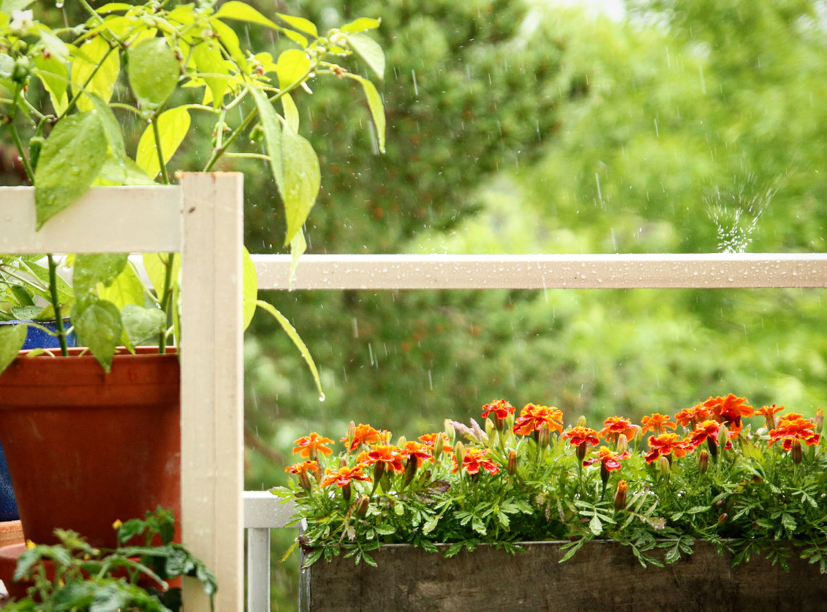 Especially when it rains. The sound of the heavy summer drops on the roof, the smell of moist soil, the intensity of greens, bright chili leaves, darker tomato, the bluish tint of the pine needles just beyond, and then brighter again, in the ash tree. Purple-gray shades on the clouds. And in the middle, orange, creating a contrast so deliciously seductive, the marigolds. I can’t get enough.