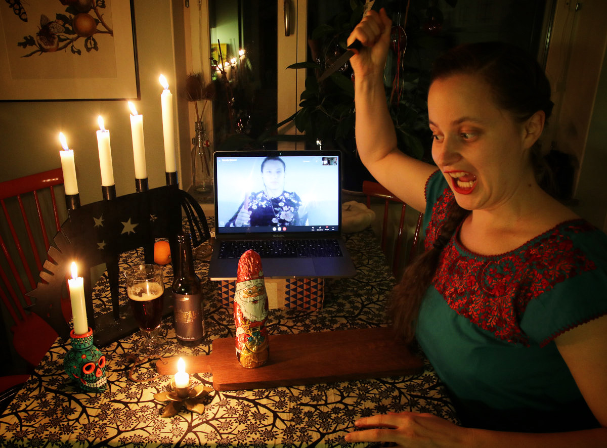 In the pre-Christian times, the blot was a blood sacrifice. Me being vegetarian, the bloodshed felt outdated – so we sacrificed a chocolate Santa instead. (Although, as it turns out, sacrificing chocolate can also turn violent…) Dressed in our most season-appropriate finery, with fire (candles), mjöd (beer) and some well-chosen words to lay the past year to rest. And then we rounded off the evening with some eggnog and Buffy the Vampire Slayer. All conducted over Skype, of course.