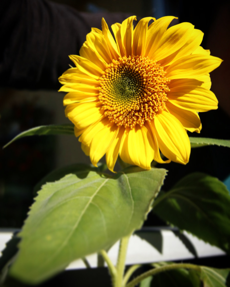And admire the baby sunflower that sprouted from one of my tomato pots. I must have mixed the soil in that pot with some leftovers from last year, soil that stood under the bird-feeder I had on the balcony last winter. A strange plant started growing in the pot next to the tomato, and I thought: Why not see what comes up? A beautiful, autumn sunflower, that’s what.