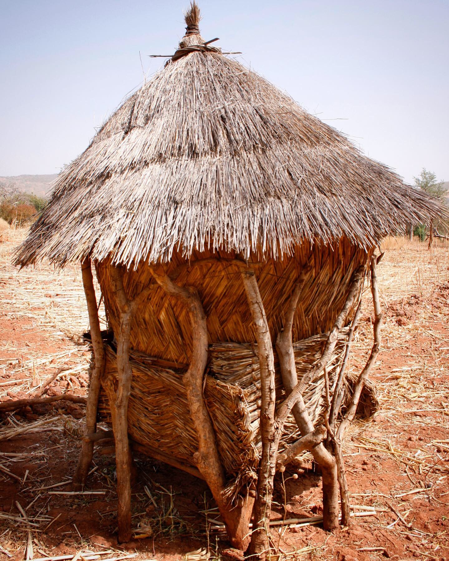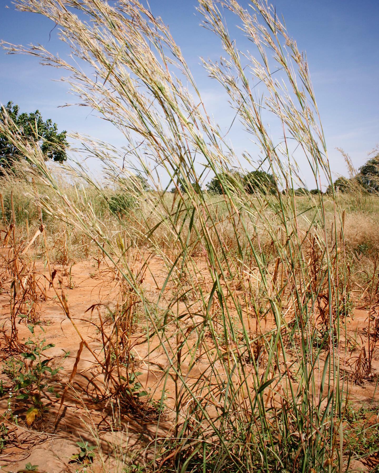 Boys weaving pitri grass (Andropogon gayanus / Gamba grass)*. Together with wood, the woven grass is used to construct granaries. The granaries are used to store sorghum, millet and other grains during the dry season. The pitri grass grows wild and could be considered a weed. However, if it takes root in the fields, it is often left to grow to mature size because of its value as construction material.